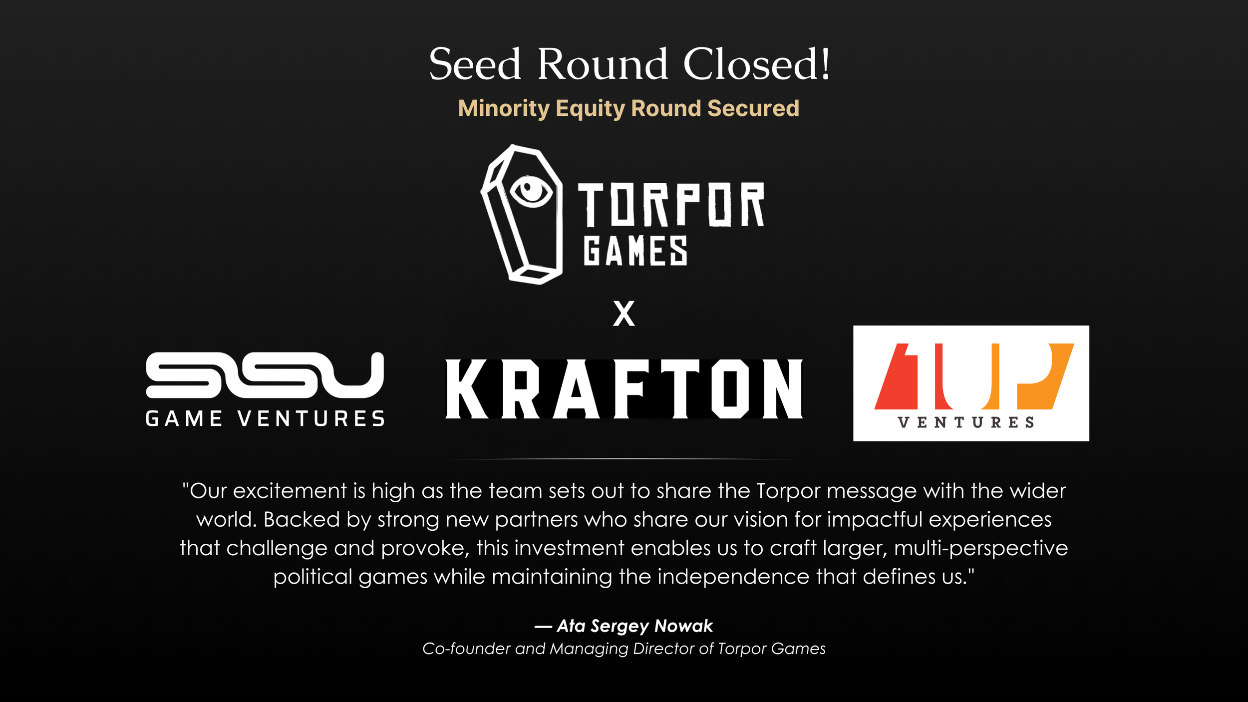 Berlin, November 20th, 2025 — Independent studio Torpor Games today announced the closing of a minority seed investment round with participation from KRAFTON, 1Up Ventures, and Sisu Game Ventures, with legal guidance from Igor Rudolph of Brehm v. Moers and Norton Rose.
