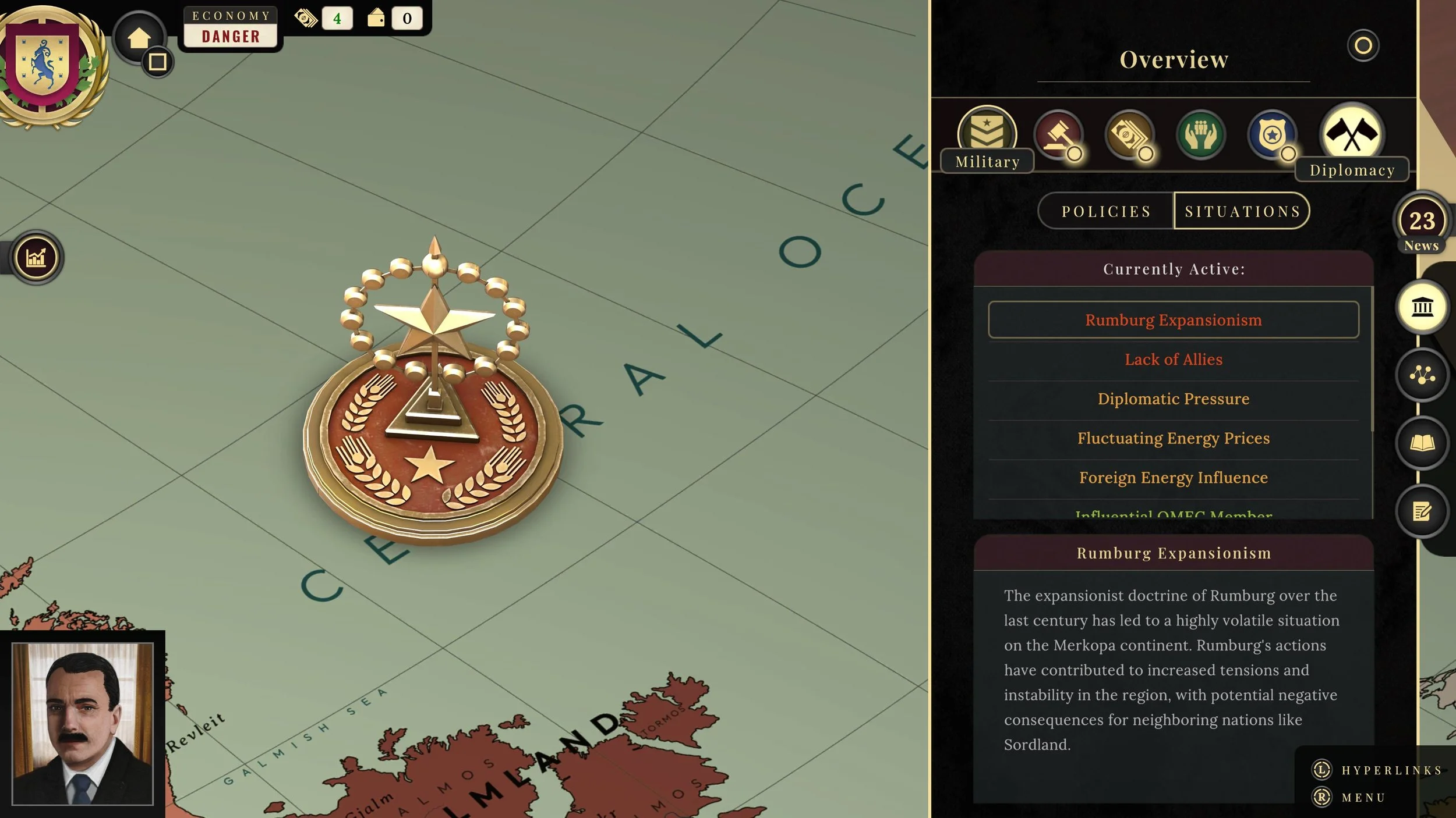 Stay Informed: Keep tabs on the state of affairs through country or interactable city tokens, policies, situations, news and reports. See the impact and result of your actions.